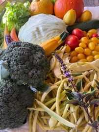 Veronika breitet ihre wöchentliche Gemüsetasche zu Hause aus und überlegt sich den Menüplan für die nächsten Tage. Bei diesem reichhaltigen Angebot ist das Kochen ein Vergnügen.