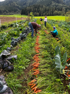 Die Karotten eines Dammes wurden aus der Erde gezogen, vom Karottengrün befreit und in den Vorratskeller gebracht.