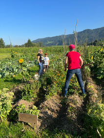 Viele helfen bei der Ackerpflege mit: Kinder setzen Buschbohnen, Mütter und Omas lockern die Dämme und beseitigen Beikräuter. Praktikanten der Gemeinde mähen die Wege.