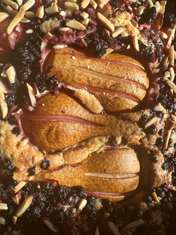 Die Birnenhälften in der Mitte anordnen und die Apfelspalten dicht nebeneinander um die Birnen herum auflegen.