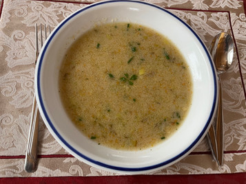 Porree-Grießsuppe, Birnennockerl, garniert mit Granatapfelkernen und Walnüssen, dazu Chinakohl-Salat.