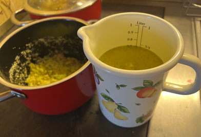 Rotkraut, Orangenschale und -saft und die restlichen Zutaten dazugeben und ca. eine Stunde kochen (verwendet man fermentiertes Rotkraut reicht 1/2 Stunde Kochzeit).